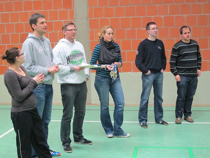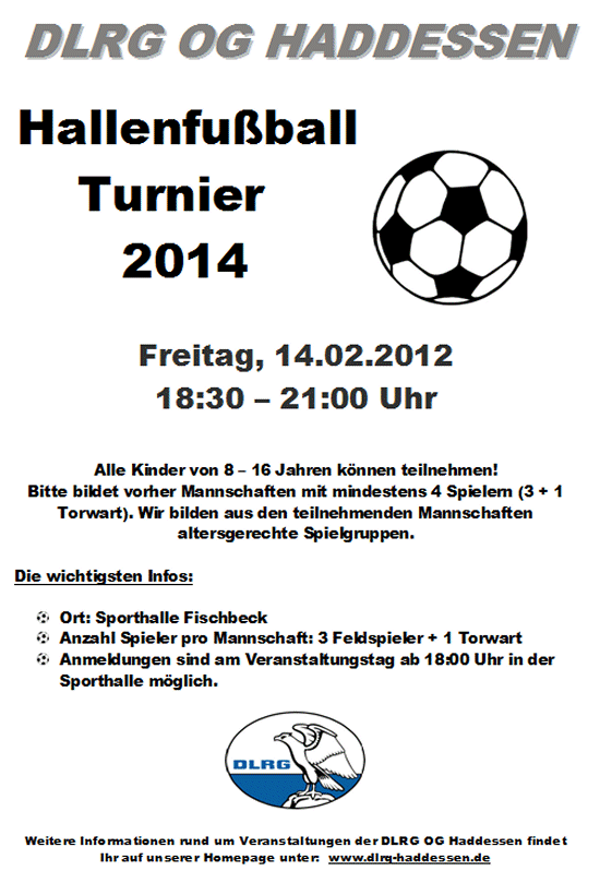 Insgesamt 5 Mannschaften und etliche Zuschauer fanden sich am 14.Februar in der Sporthalle Fischbeck ein, um gemeinsam Spaß zu haben beim alljährlichen DLRG-Hallenfußballturnier der DLRG-Ortsgruppe Haddessen. Zum 7.Mal in Folge konnten Jungen und Mädchen im Alter von 8-16 Jahren an dem Turnier für jedermann teilnehmen. Aber nur 1 Mädchen hatte sich angemeldet: Pia Holland-Letz. Sie startete in der Mannschaft 'Master of Desaster' und am Ende des Turniers ergab sich folgende Platzierung: