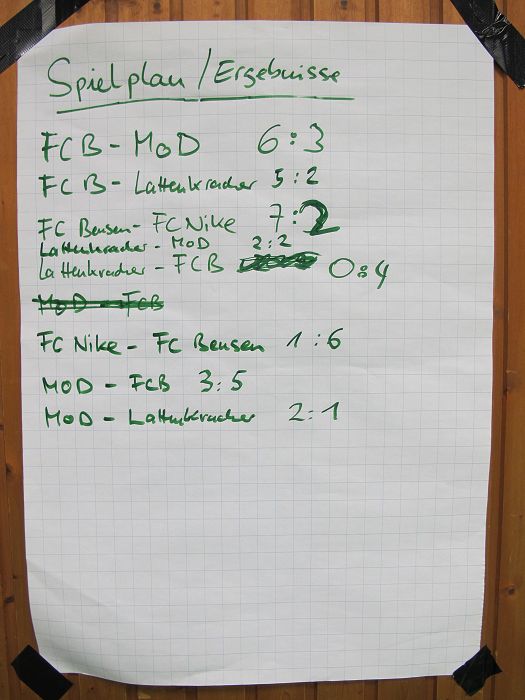 In der Altersgruppe 8-12 Jahren kam auf den dritten Platz die Mannschaft 'Lattenkracher' mit 1 Punkt. Auf den 2.Platz mit 4 Punkten platzierte sich die Gruppe 'Master of Desaster' und auf Platz 1 mit 12 Punkten stand auf dem Siegertreppchen die Mannschaft 'FC Bayern München' mit Vincent Lohmar, Noah Schwitzer, Rene Nonnewitz, Mario Nonnewitz und Bjarne Hartmann. In der Altersgruppe 13-16 Jahre belegte die Gruppe 'FC Nike' den 2. Platz. Den ersten Platz erkämpfte sich die Gruppe 'FC Bensen' mit Marc Neumann, Domenik Galluschke, Frederik Galluschke und Jan�Ole Battermann.