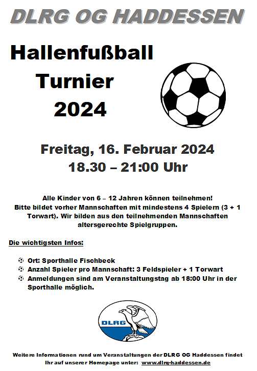 Am Freitag, den 16.Februar 2024 startete wieder das traditionelle DLRG-Hallenfußballturnier in der Fischbecker Sporthalle. 4 Mannschaften im Alter von 6 - 12 Jahre traten gegeneinander an.