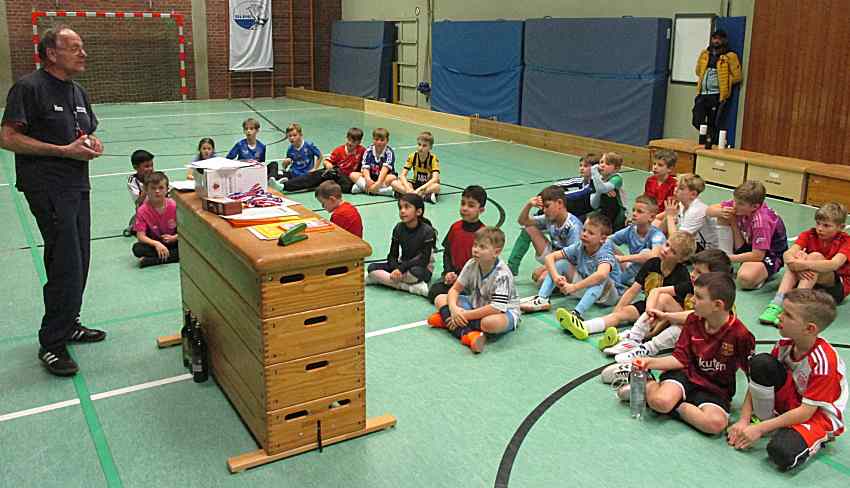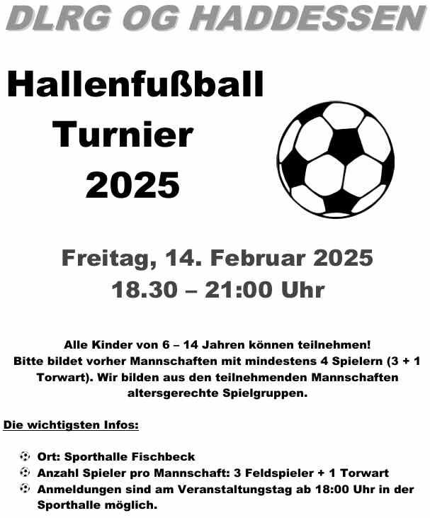 Am Freitag, den 14.Februar 2025 startete wieder das traditionelle DLRG-Hallenfußballturnier in der Fischbecker Sporthalle. 3 Mannschaften im Alter von 7 - 8 Jahre und 2 Mannschaften im Alter von 9 – 11 Jahre traten gegeneinander an. Bereits um 18.00 Uhr konnten sich die Mannschaften anmelden und auch einspielen, begleitet von Geschwistern und Eltern, Freunden und Bekannten und zum Teil von eigenen Trainern. Nach der Anmeldung wurden um 18.30 Uhr im Rahmen der Begrüßung die Spielregeln und die Mannschaftsaufstellung bekanntgegeben. Die Spieldauer betrug am Anfang 15 Minuten.