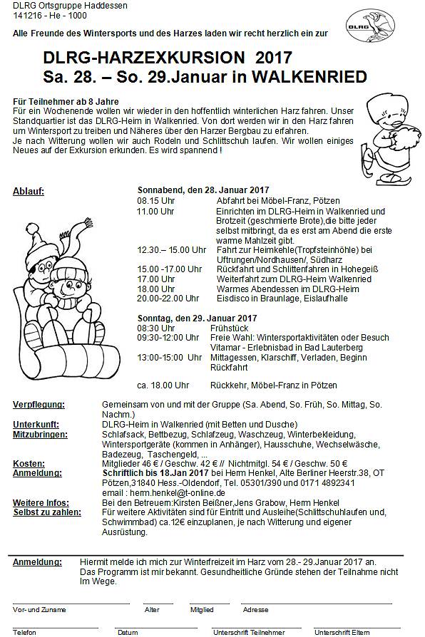 'Hurra � so viel Schnee' riefen die Kinder und dazu noch Sonne pur. Der Winter zeigte sich von seiner schönsten Seite, als die DLRG-Ortsgruppe zu Ihrer alljährlichen Harzexkursion vom 28.-29.Januar 2017 im Harz ankam. Vor dem DLRG-Heim in Walkenried türmten sich die Schneemassen und der Fußweg auf den letzten Metern war noch tückisch mit einer Eis- und Schneeschicht bedeckt.