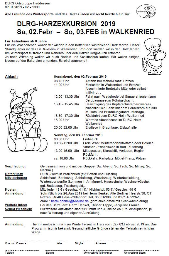 Pünktlich um 08.15 Uhr trafen sich am 02. Februar 2019 13 Teilnehmer und 3 Betreuer in Pötzen bei 'Möbel-Franz' um nach kurzem Kennenlernen und notwendiger Einweisung die Fahrt in den Harz anzutreten.