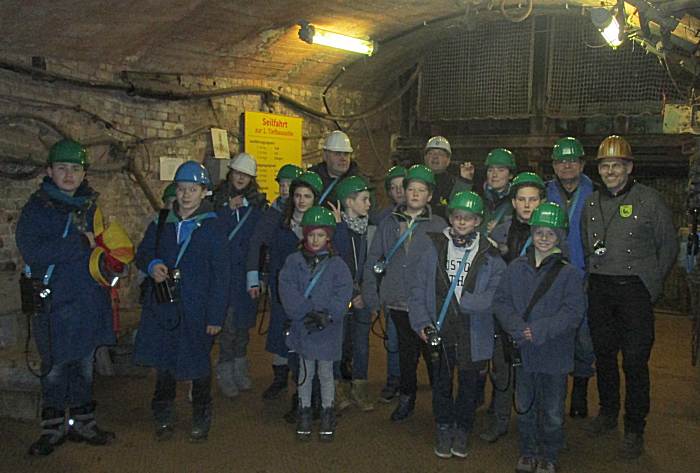 Danach hieß es wieder einsteigen in die 2 Kleinbusse und die Fahrt führte uns nach Wettelrode bei Sangershausen, um in den dortigen Röhrigschacht einzufahren. Welch Erlebnis: Nachdem alle Teilnehmer Kittel, Helm und Leuchte erhalten hatten, ging es mit dem Fahrkorb auf 283 Meter Tiefe und von dort 1 km mit der Grubenbahn zu den Abbauorten. Hier konnten wir anhand von Schauobjekten erfahren, wie der Abbau von den Anfängen bis zur Neuzeit bis 1990 sich entwickelt hatte.