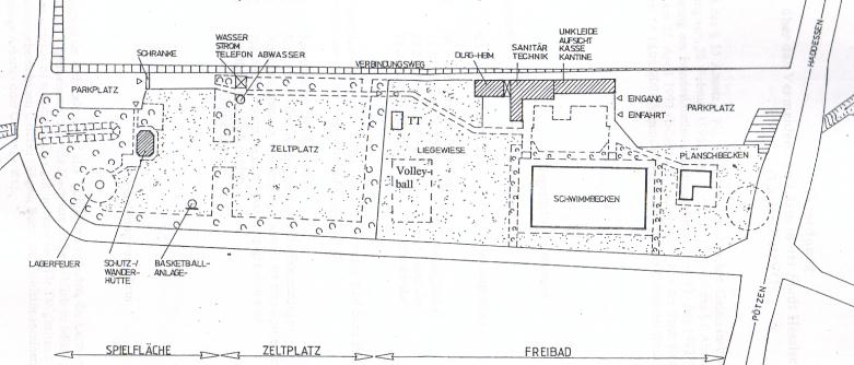 - Östlich und westlich grenzen landw. Nutzflächen das Freibadgelände ein, südl. Lagerfeuerplatz (10 m Durchmesser), ein offener Bach, Parkplatz für Zeltgruppen und eine Schutzhütte.