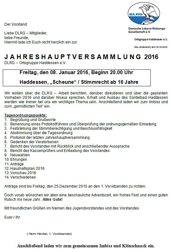 Alles in allem eine positive Bilanz, die der Vorstand der DLRG-Ortsgruppe Haddessen am 8. Januar in der 'Scheune' in Haddessen vorstellen konnte. Auf der gut besuchten Versammlung ging es vor allem um die Veranstaltungen des letzten Jahres, um Neuwahlen, Ehrungen der langjährigen Mitglieder und Verabschiedung ausscheidender Vorstandsmitglieder und um das Programm für 2016. Anträge waren nicht gestellt worden.