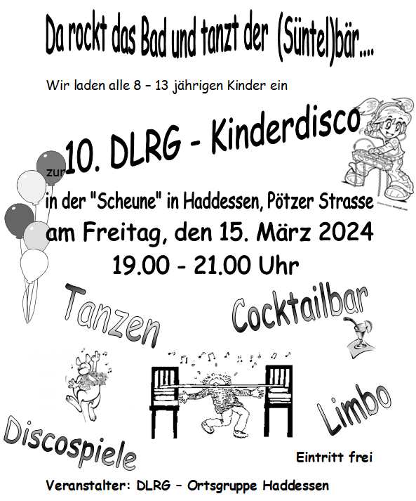 In der Pause gab es Knabberzeug und alkoholfreie Drinks – alles kostenlos. Nach der Pause waren alle Kids beim „Stop-Tanz“ wieder voll dabei. Die Stimmung war die gesamten 2 Stunden super und schade eigentlich, dass alles nach 2 Stunden zu Ende ging. Mit auf den Heimweg nahmen die Kinder Informationsblätter für das DLRG-Workcamp im Süntelbad vom 18. - 22. März 2024 und das Sommerprogramm der DLRG-Ortsgruppe Haddessen.
