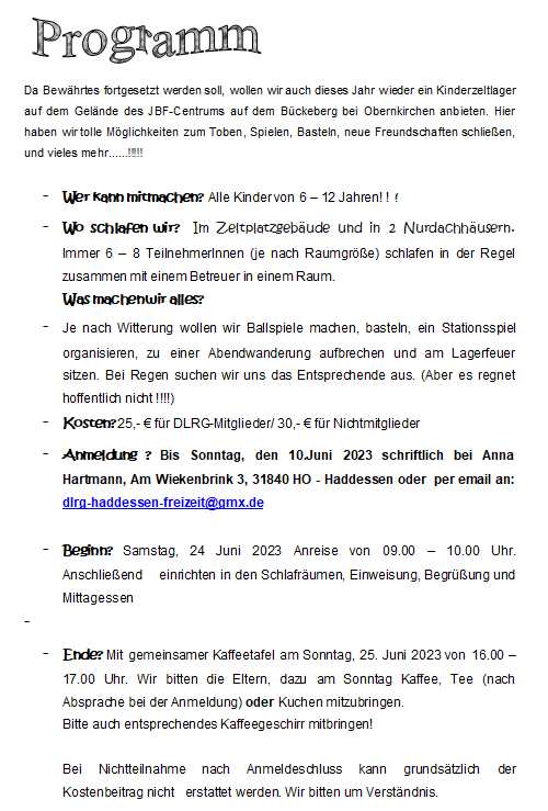 Nachdem am Donnerstag, den 22.Juni 2023 Starkregen heruntergekommen war, hatten wir schon Bedenken für die Durchführung des Kinderzeltlagers 2023, das wieder einmal im JBF-Centrum Bückeberg auf den Höhen des Bückeberges mitten im Wald durchgeführt werden sollte. Aber schon ein Tag später beim Verladen der vielen Materialien im Süntelbad Haddessen an unserm DLRG-Heim, war wieder super Sonnenschein und der sollte uns auch das ganze Wochenende begleiten. So konnten wir am Freitag wie geplant unser großes Essenszelt und Spielzelt bei gutem Wetter aufbauen und wir hatten noch genügend Zeit, die Programmpunkte für den nächsten Tag vorzubereiten.