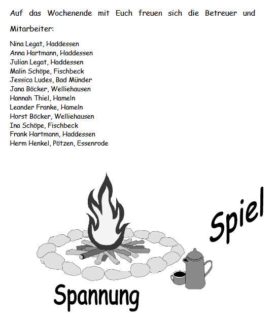 Mein Dank gilt allen, die dieses tolle Wochenende ermöglicht haben, an die Betreuer Nina Legat, Julian Legat, Malin Schöpe, Jessica Ludes, Jana Böcker, Hannah Thiel, Leander Franke, Horst Böcker, an unsere Küchencrew Ina Schöpe und Frank Hartmann, an Markus Weber, der uns wieder mit Holz versorgte, an Jens Manentzos, der uns die Holzteile für das Insektenhotel gefertigt hat und Jörg Diekmann, der diese Holzteile noch vorgebohrt hat, an den Oliver Nacke vom NABU, der das Material für das Insektenhotel bezuschusst hat, an Stephanie Hengstermann, die die Brötchen am Sonntag und an Wilma Flettner, die uns den Kuchen am Samstag gespendet hat, an die Grundschule Fischbeck die uns Ausrüstung geliehen hat. Dank auch an die Eltern für alle Unterstützung, Kuchenspenden und Vertrauen in die Betreuer und Dank an die Kinder, die mit wenigen Ausnahmen toll mitgemacht haben und sehr diszipliniert waren.