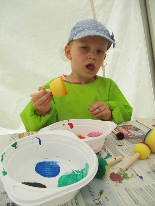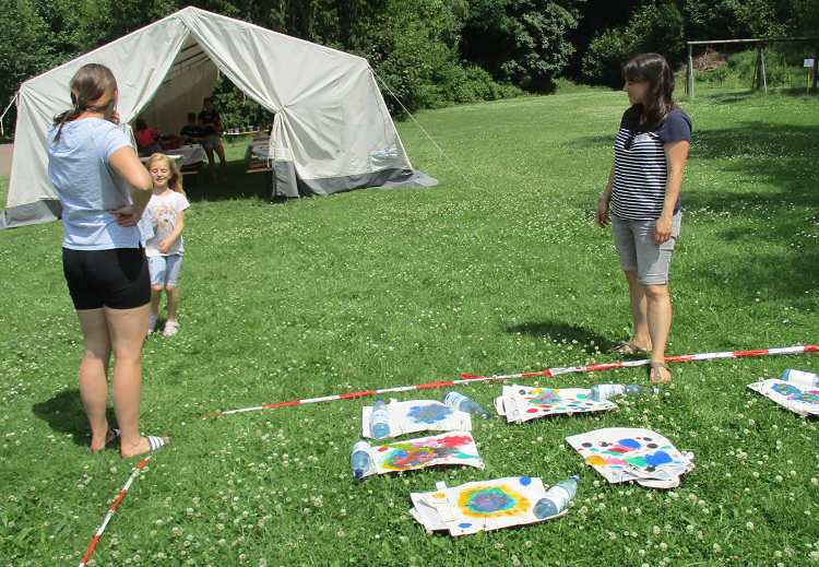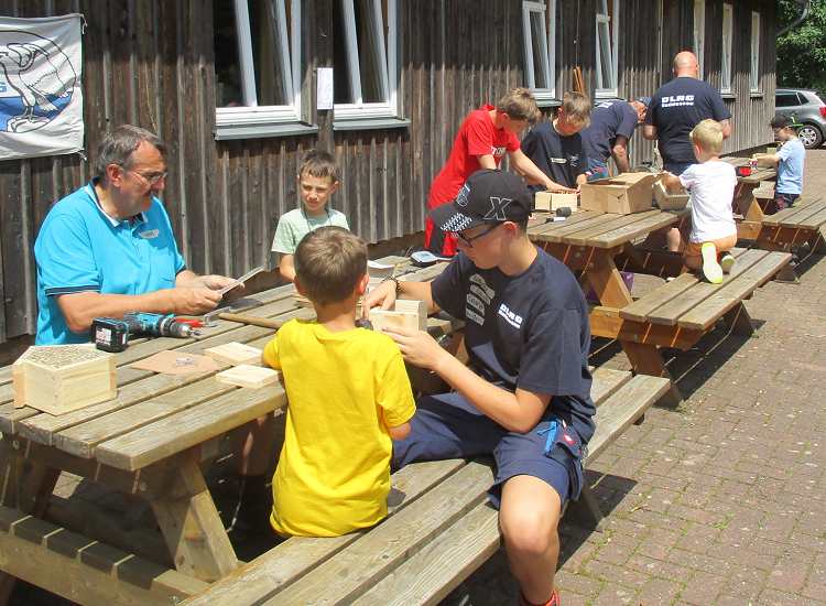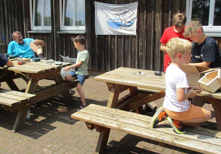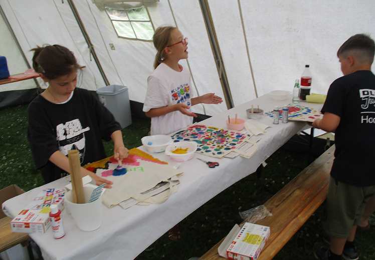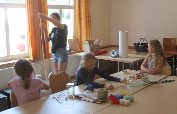 Das Mittagessen mit der traditionellen Lagersuppe kam gut an und so gestärkt machten sich die Kinder ans Basteln. Es konnten Stofftaschen mit Textilfarbe bemalt werden, es wurden Makramee-Arbeiten geflochten, Blumentöpfe bemalt und Insektenhotels aus Holzwänden, Bruthülsen und Karnickeldrahtgeflecht gebaut.