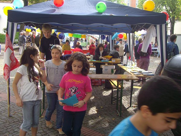 An unsern Ständen gab es auch Fachfragen zu Anfängerschwimmkursen und Freizeiten und Jugendarbeit. Irgendwie war es auch spannend für mich, wie sich alles aufgebaut hat, wie sich die teilnehmenden Gruppen darstellten an ihren Ständen. Interessant auch der Info- und Spielbus des Stadtjugendringes Hameln, der Riesenmenschenkicker vom Verein für Kinder- und Jugendarbeit Hess.-Oldendorf e.V. und die Riesenhüpfburg der Stadtwerke Hameln.