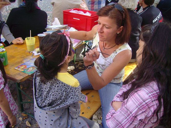 Genialerweise war unser gemeinsamer Stand direkt gegenüber der Veranstaltungsbühne und im Lauf des Tages waren unsere Tische und Bänke immer mehr auch willkommene Sitzgelegenheit für Zuschauer, die das umfangreiche und abwechslungsreiche Programm auf der Bühne verfolgen wollten. Es gab Gesangsdarbietungen, Tänze, sportliche Einlagen und Musikvorführungen.