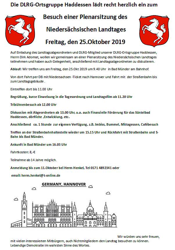 Auf Einladung des Landtagsabgeordneten und DLRG-Mitglied unserer DLRG-Ortsgruppe Haddessen, Hern Adomat, haben wir am Freitag, den 25.Oktober 2019 mit 17 Teilnehmerinnen und Teilnehmern den Landtag in Hannover besucht. Nachdem sich 2 Teilgruppen am Bahnhof in Hameln, bzw. Bad Münder zur Abfahrt getroffen hatten, ging es per Niedersachsen - Ticket nach Hannover. Nach Umsteigen brachte uns die S-Bahn 7 bis zur Station Markthalle. Von dort waren es nur wenige Meter bis zum neu errichteten Landtagsgebäude.