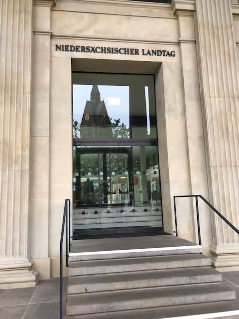 Bereits im Umfeld zeigten uns Kamera-Teams des NDR, Polizeistreifen und Mitarbeiter der Landtagsverwaltung, dass wir in eine andere Welt eintauchen würden. Pünktlich um 11.00 Uhr wurden wir in das Hohe Haus hineingebeten und nach Check in und Begrüßung standen wir in der großen Eingangshalle des Landtagsgebäudes, das vor einigen Jahren nach 3-jähriger Bauzeit und 58 Mill. Euro Baukosten wieder in Nutzung genommen werden konnte. Die Würde des Hauses spiegelte sich in dem Baukörper und in der ruhigen Atmosphäre, die überall herrschte. Nach einer weiteren Information und Film über das Gebäude und die Zusammensetzung und die Aufgaben und die Arbeit des Niedersächsischen Landtages durften wir von 12.00-13.00 Uhr im Plenarsaal die Sitzung live verfolgen. Nichts mehr von der Ruhe im Foyer, vielmehr wuseliges Treiben, einige Abgeordnete standen in kleinen Gruppen und redeten, viele arbeiteten an Tablett, Laptop und Handy, einige verließen den Saal, andere kamen wieder herein.