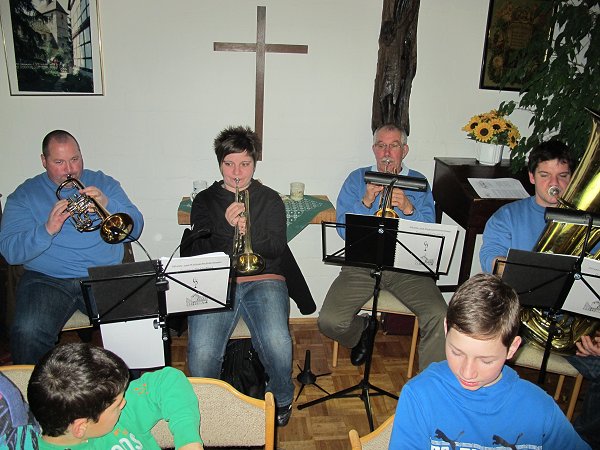 Zum Schluss spielt der Posaunenchor und zufrieden ausschauende Eltern und Kinder und Freunde der Nikolausfeier, klein und groß, jung und alt, gehen wieder in den dunklen Abend und treten ihren Heimweg an.