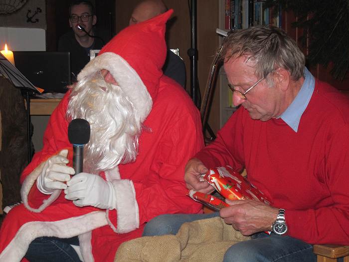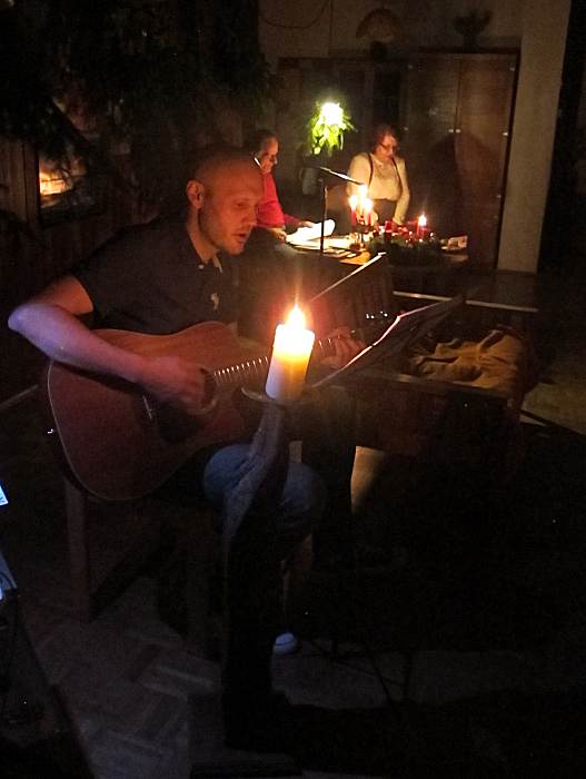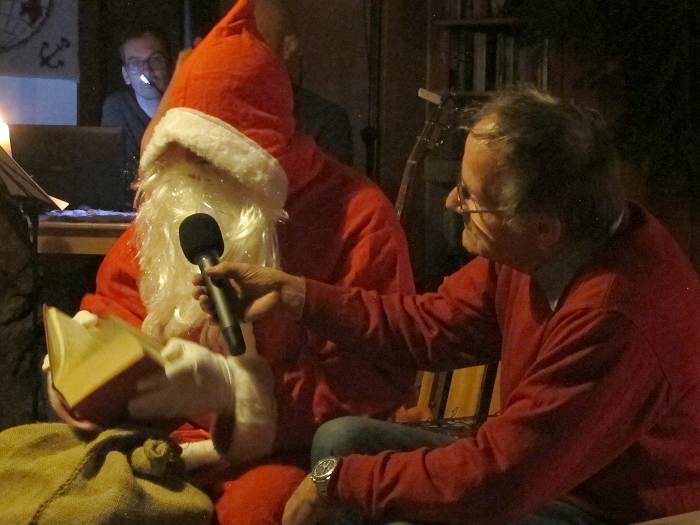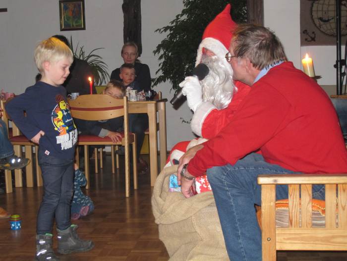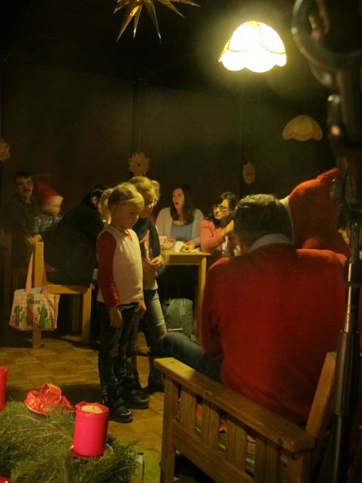 So sollte es doch noch eine Weile dauern bis der Nikolaus zu den Kindern in die Scheune kam und bis dahin wurde, nachdem die erste Kerze auf dem Vorlesetisch angezündet worden war, die Zeit genutzt, um Lieder zu singen, Geschichten zu hören oder sich mit adventlichen und winterlichen Gedichten auf die nächsten Wochen einzustimmen. Die Gäste in der Scheune konnten sich an Gedichten und Geschichten von Yvonne Passenheim und Herm Henkel erfreuen und natürlich von Herzenslust bei den vielen Adventsliedern mitsingen. Begleitet wurden die Besucher von Stefan Ludes auf der Gitarre. Nach kräftigen mehrmaligen Rufen kam auch der Nikolaus in die warme Scheune. Das war auch dringend nötig, hatte doch der gute alte Mann seinen Weg in die Scheune nach Haddessen in diesem Jahr auch wieder über den hohen waldigen Süntel nehmen müssen.