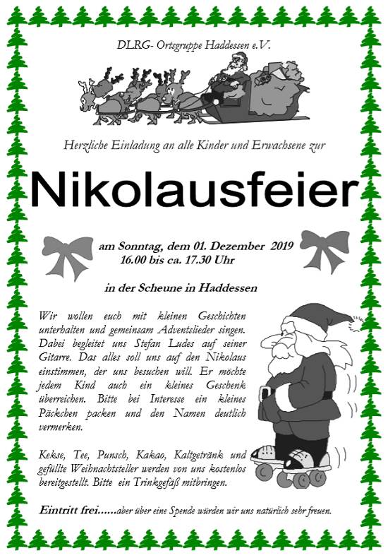 Alljährlich am ersten Advent treffen sich die Kleinen wie die Großen in der Scheune in Haddessen zur Nikolausfeier der DLRG-Ortsgruppe Haddessen. Ist es doch die besondere, gemütliche Atmosphäre des Raumes und die bunte Mischung aus Punsch-, Tee- , Kakao- und Tannenduft. An den Wänden hängen Tannenzweige, auf den Tischen laden bunte Teller mit Keksen, Nüssen und Äpfel zum Naschen ein und die Tische sind mit Kerzen und Tannenzweigen adventlich geschmückt.