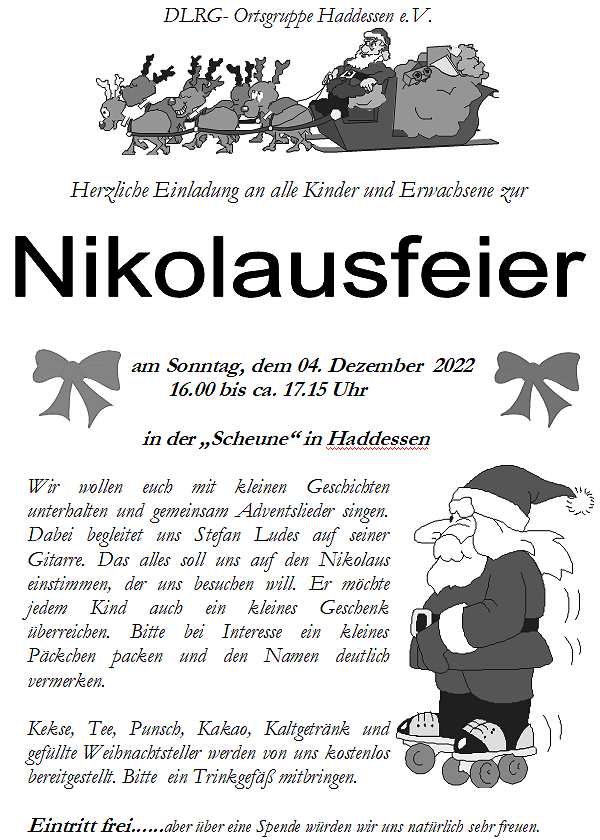 Alljährlich am ersten Advent treffen sich die Kleinen wie die Großen in der 'Scheune' in Haddessen zur Nikolausfeier der DLRG-Ortsgruppe Haddessen. Ist es doch die besondere, gemütliche Atmosphäre des Raumes und die bunte Mischung aus Punsch-, Tee-, Kakao- und Tannenduft. An den Wänden hängen Tannenzweige, auf den Tischen laden bunte Teller mit Keksen, Nüssen und Äpfel zum Naschen ein und die Tische sind mit Kerzen und Tannenzweigen adventlich geschmückt.