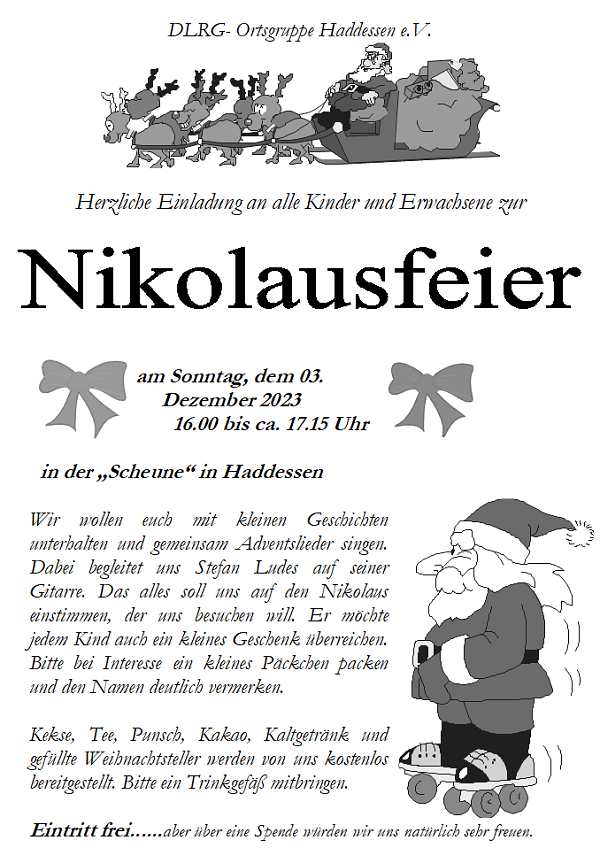 Alljährlich am ersten Advent treffen sich die Kleinen wie die Großen in der 'Scheune' in Haddessen zur Nikolausfeier der DLRG-Ortsgruppe Haddessen. Ist es doch die besondere, gemütliche Atmosphäre des Raumes und die bunte Mischung aus Punsch-, Tee-, Kakao- und Tannenduft. An den Wänden hängen Tannenzweige, auf den Tischen laden bunte Teller mit Keksen, Nüssen, Mandarinen und Äpfel zum Naschen ein und die Tische sind mit Kerzen und Tannenzweigen adventlich geschmückt. Auch in diesem Jahr trafen sich wieder Jung und Alt in der 'Scheune'. Mit Schnee und Frost war das Wetter genau passend, um mit dem Schlitten zur Nikolausfeier zu kommen. So freuten sich Jung und Alt, Kinder, Eltern, Großeltern und alle Freunde der DLRG-Nikolausfeier in der 'Scheune' in Haddessen gemütlich beieinander zu sitzen und gespannt auf das zu warten, was jetzt wohl kommen würde.
