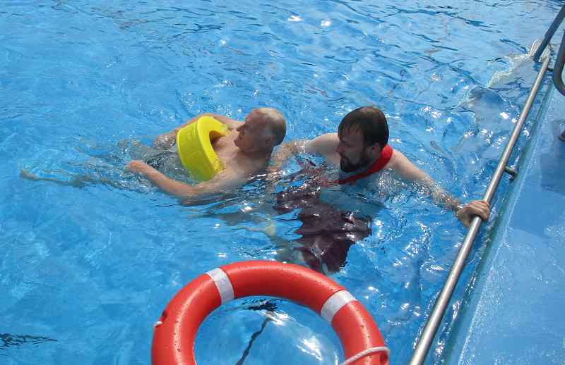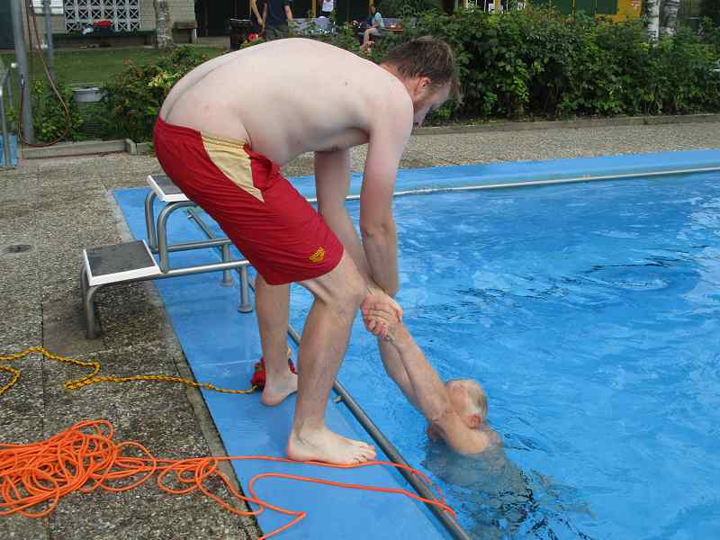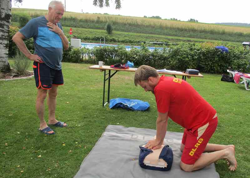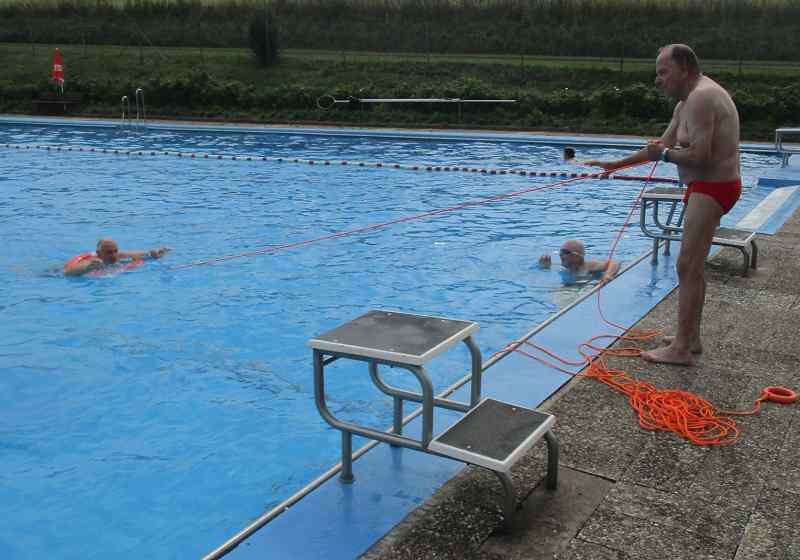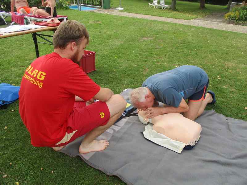 mit verschiedenen Rettungsmitteln üben, u.a. mit der Rettungsstange, dem Rettungsring, dem Gurtretter, dem Wurfsack und dem Rettungsball. Mit auf dem Programm stand auch die Übung der Wiederbelebung mit Hilfe der HLW-Puppe.