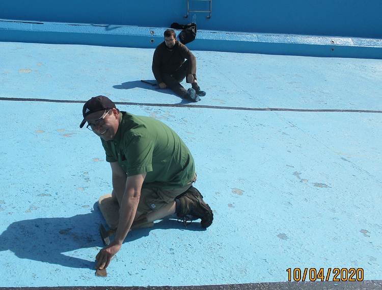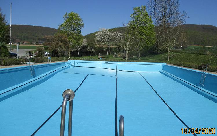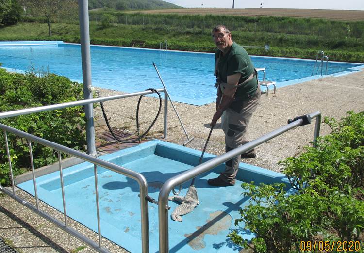 Im Moment laufen lediglich die zwingend notwendigen Vorbereitungen für die Saison 2020: Mit Genehmigung des Ordnungsamtes Hess.-Oldendorf sind wir zur Zeit streng nach Absprache mit maximal 2 Trupps zu je 2 Personen dabei das Schwimmbecken für den Badebetrieb herzurichten. So ist seit Anfang März das Wasser abgelassen worden, das Schwimmbecken konnte geschrubbt werden und seit dem 21.März sind wir dabei die alte Farbe abzuspachteln und das große Schwimmbecken zu streichen. Diese Arbeiten konnten am Ostersamstag bei bestem Frühlingswetter abgeschlossen werden.