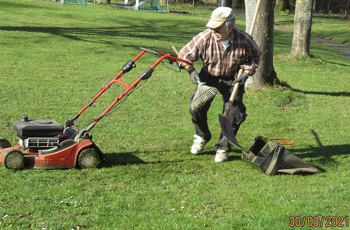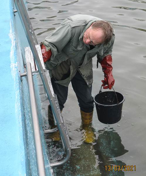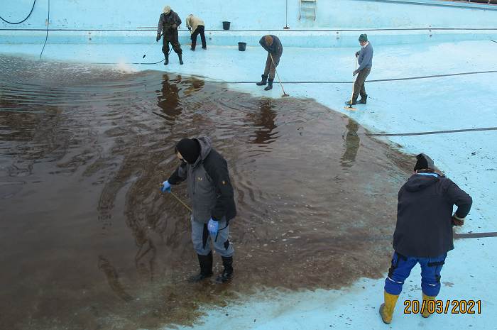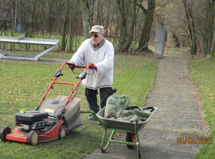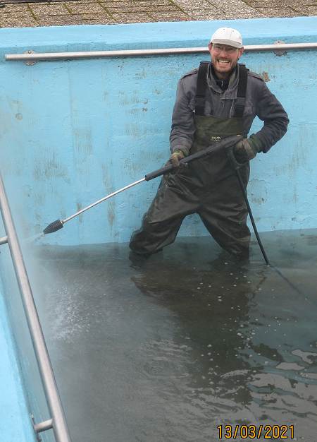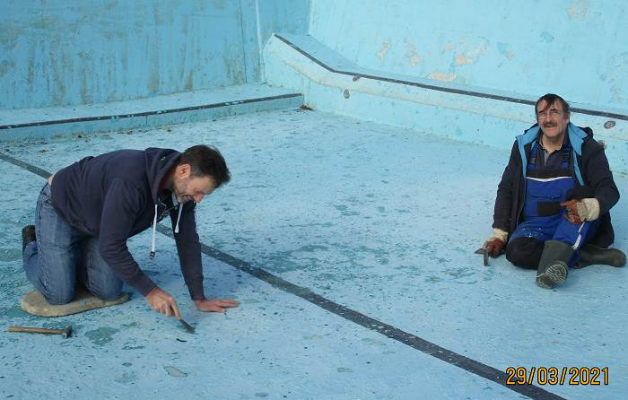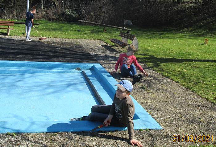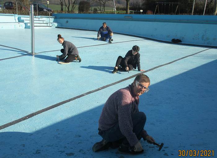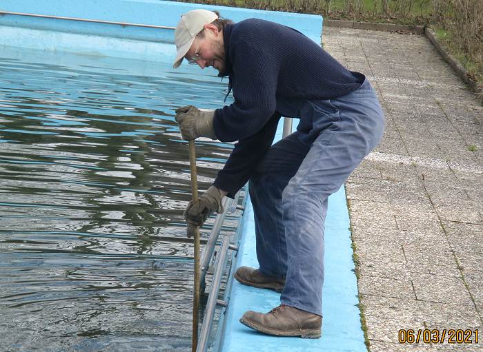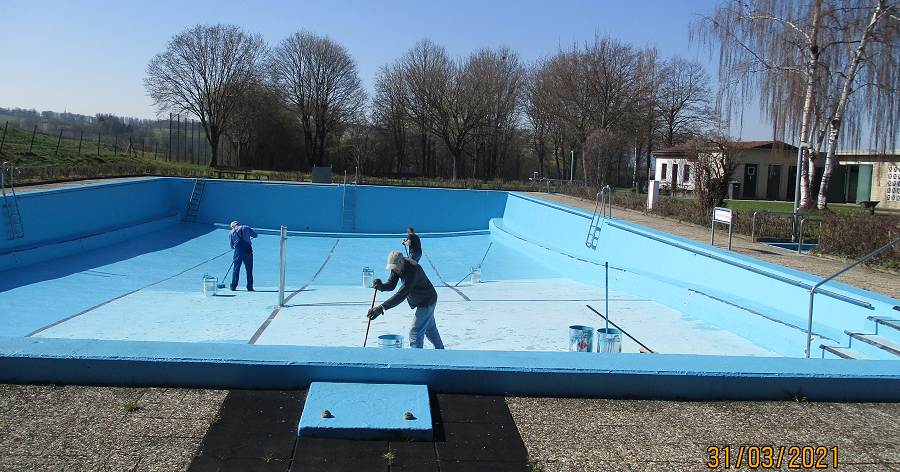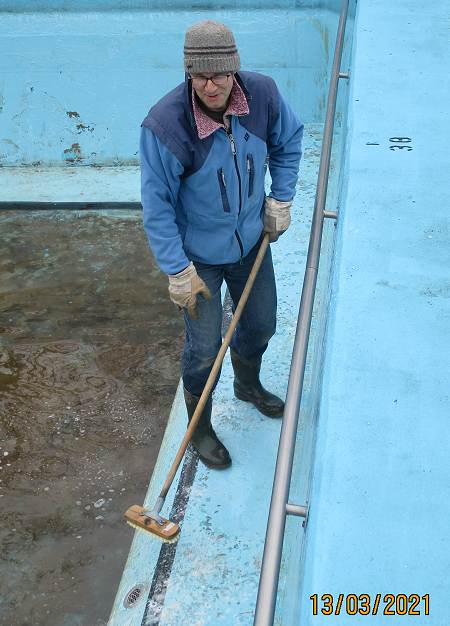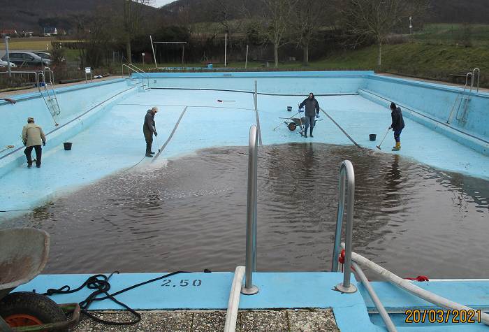 So konnten am Montag, den 29. März die Arbeiten beginnen und das fortsetzen, was bereits ab den 6. März 2021 jeden Samstag durchgeführt worden war. Bereits bei den vergangenen Arbeitseinsätzen waren die Frostsicherungsbalken aus dem Wasser geholt und ins Sommerlager zurücktransportiert worden, das Schwimmbeckenwasser abgelassen und das Schwimmbecken mit Hochdruckreiniger und Schrubber gereinigt worden. Auch wurde damit begonnen, die lose Farbe von den Betonwänden abzuspachteln und die Sitzbänke für den Lagerfeuerplatz wieder herauszustellen.