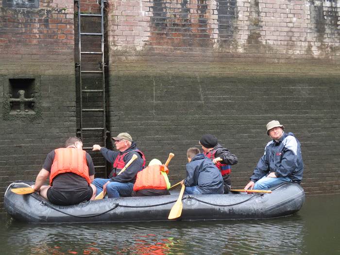 Nach leichter Fahrt zur Schleuse Hameln bei Wasserstand von 1,35 m Pegel Hameln ging es mit 2 Schlauchbooten in die riesige Schleusenkammer von über 300m Länge.