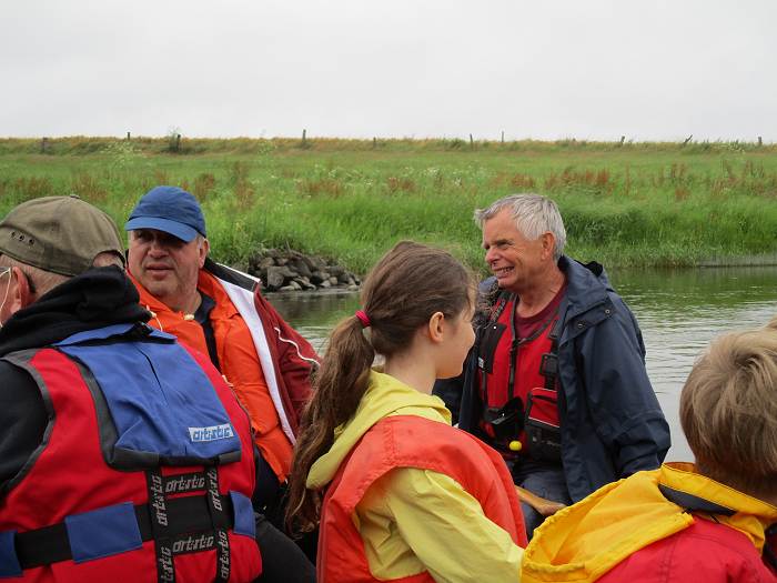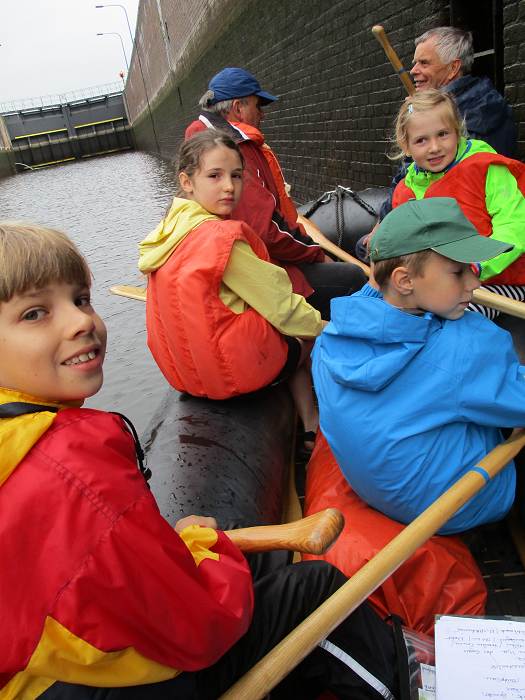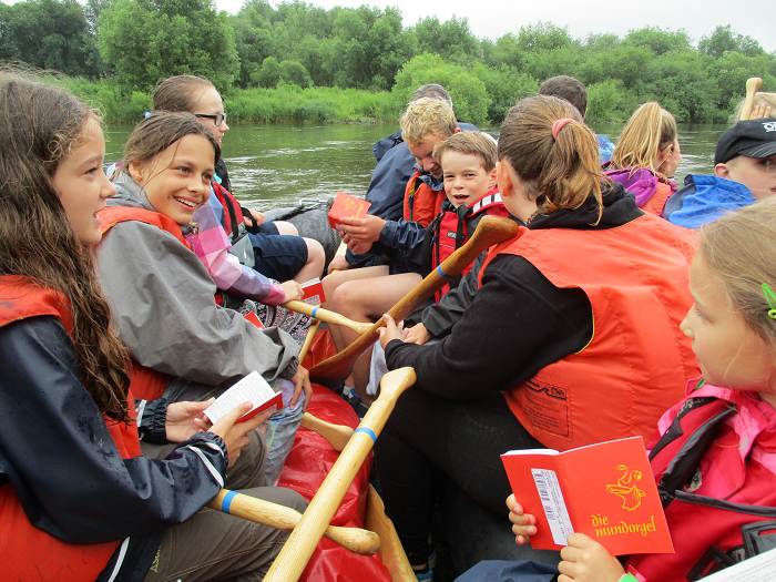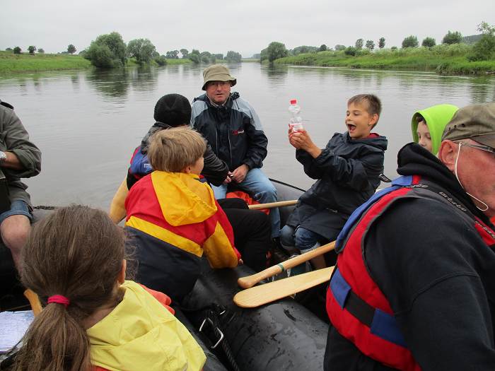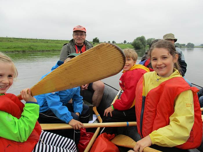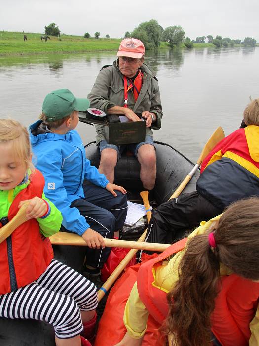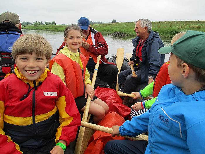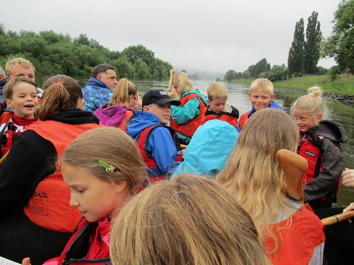 Nur ein Sportboot kam uns auf der Strecke von Hameln nach Großenwieden auf den 18 Stromkilometern entgegen. Das Wetter hielt sich, ab und zu ein kleiner Schauer, aber die Kinder und Erwachsenen hatten gute Kleidung und gute Einstellung mitgebracht. Die Gruppe lernte schnell das paddeln und bald waren auch alle Informationen über die Weser, die wichtigsten Kenntnisse über Boot und Schiffsverkehr vermittelt und die Teilis vertrieben sich die Zeit mit paddeln, dösen, Ball spielen, Lieder singen, Lunchpaket essen,...