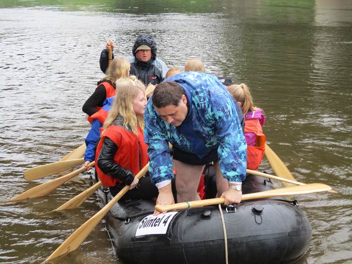 Das Ziel Rinteln war nur 12 km entfernt, aber bei starkem Westwind muss da schon Pufferzeit eingeplant werden. Wie bei der Vormittagstour kam auch ein Takt ins Paddeln, gar nicht so einfach, und das bei dem Gegenwind und gelegentlichen leichten Schauern. Auch jetzt wechselten sich paddeln, Ball spielen, Kennenlernspiele, Singen und treiben lassen einander ab. Die Stimmung war gut und die gelegentlichen Regenschauer ließen die gute Stimmung auch nicht wegbrechen. Wir waren bereits um 18.00 Uhr am Freibad/ Weserbrücke Altstadt in Rinteln, 1 Stunde früher als geplant. So hatten wir ausgiebig Zeit zum Abbauen, Verpflegung fassen und uns bei allen zu bedanken, die diese Tour ermöglicht hatten. Dank geht an die Steuerleute Jürgen Tyralla, Wilfried Nagel, Reiner Tappe und Herm Henkel, der Dank geht an die Service-crew Herbert Grohowski vormittags und Stefan und Jannes Passsenheim nachmittags und an die DLRG-Ortsgruppe Hameln, deren Gelände und Heim wir beim Start nutzen konnten und an die Schleuse Hameln. Eine schöne Tour und die positiven Reaktionen der Teilnehmer ermutigen uns, auch im nächsten Jahr wieder eine Schlauchbootfahrt im Rahmen der Aktion Ferienpass anzubieten. Aber nach 2 Jahren grenzwertigen Witterungsbedingungen wünschen wir uns wieder so einen tollen Tag, wie er am Tag vorher und am Tag nachher war. Irgendwie seltsam, oder?