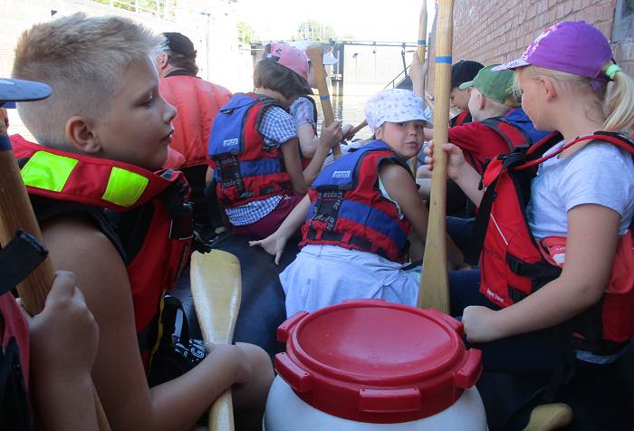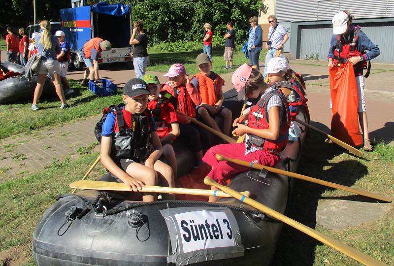 Nur ein Sportboot kam uns auf der Strecke von Hameln nach Großenwieden auf den 18 Stromkilometern entgegen. Die Gruppe lernte schnell das paddeln und bald waren auch alle Informationen über die Weser, die wichtigsten Kenntnisse über Boot und Schiffsverkehr vermittelt und die Teilis vertrieben sich die Zeit mit paddeln, dösen, Ball spielen, Lieder singen, Lunchpaket essen und der stark böige Ostwind trieb uns merklich voran, manchmal auch in die Büsche oder ans steinige Ufer. Großenwieden um 13.00 Uhr angekommen stärkten sich die Teilnehmer und die Nachmittagscrew trudelte nacheinander ein.