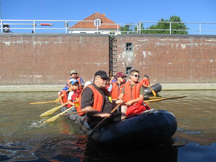 Nach leichter Fahrt zur Schleuse Hameln bei Wasserstand von 1,15 m Pegel Hameln ging es mit 3 Schlauchbooten in die riesige Schleusenkammer von über 300m Länge. Glück für uns, das die Schleuse funktionierter. Erst 3 Tage vorher mussten Treibholzstamm und Steine von THW-Tauchern gesichtet und geborgen werden, da dieses Material die Schließung des oberen Schleusentores verhindert hatte und so die schleuse nicht betrieben werden konnte.