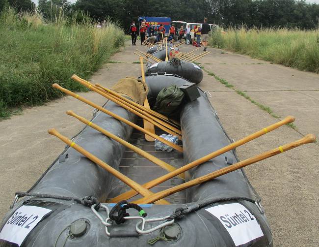 Gut gelaunt und bei noch verhaltenen, aber trockenem Sommerwetter fuhren wir Steuerleute mit der Service crew am Samstag, den 17.Julii nach Hameln, wo wir auf dem ehemaligen Übungsgelände der britischen Pioniere 'Upnor' an der Fischbecker Straße die restlichen Boote Boote aufbauen und alles für den Empfang der 24 Teilnehmer und die anschließende Nachmittagstour vorbereiten konnten. Nach check in, Anpassen der Schwimmwesten und Aufteilung der 3 Bootsmannschaften ging es über zu ersten Trockenübungen an Land, aber bereits im Boot sitzend. Dann kam der Stapellauf und erste Erfahrung mit dem hohen Wasserstand der Weser (2,99 m Pegel Wehrbergen ) und stark böigen Gegenwindmit konnten gesammelt werden.