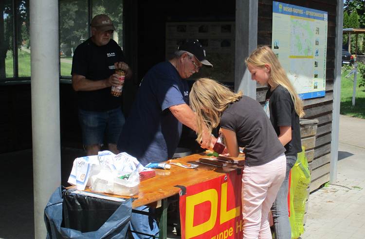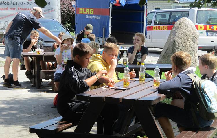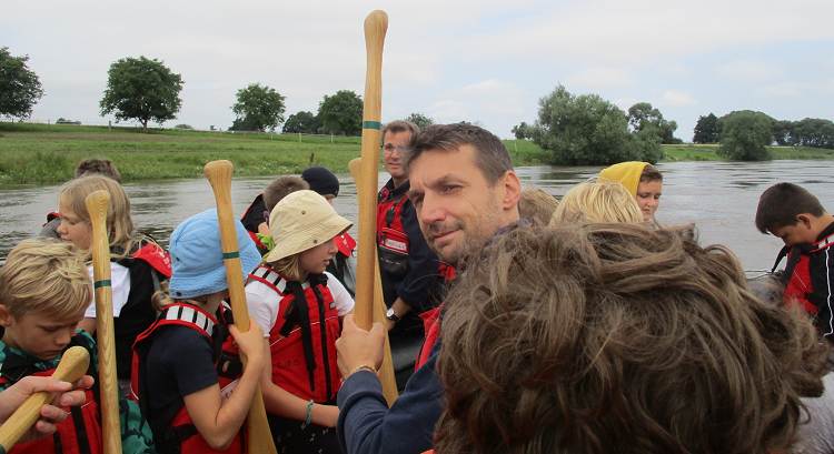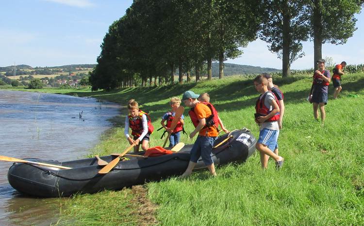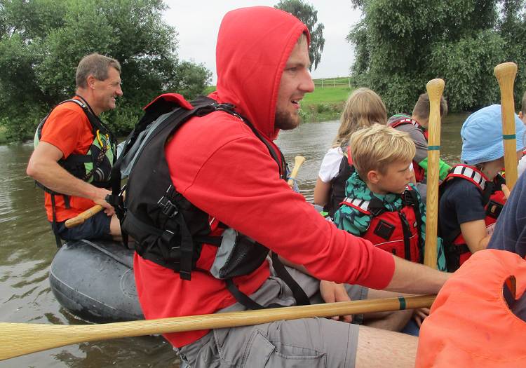 Nur ein Sportboot überholte uns auf der Strecke von Hameln nach Großenwieden auf den 15 Stromkilometern. Die Gruppe lernte schnell das paddeln und bald waren auch alle Informationen über die Weser, die wichtigsten Kenntnisse über Boot und Schiffsverkehr vermittelt und die Teilis vertrieben sich die Zeit mit paddeln, dösen, Ball spielen, Lieder singen, Lunchpaket essen und der stark böige Westwind machte es erforderlich, immer wieder zu den Paddeln zu greifen und dagegen zu steuern. Großenwieden um 12:30 Uhr angekommen stärkten sich die Teilnehmer und die Nachmittagscrew trudelte nacheinander ein.