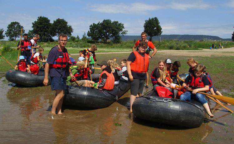 Das Ziel Rinteln war nur 12 km entfernt, aber der böige Westwind erforderte doch oftmals intensives Paddeln aller Teilnehmer und aufmerksames Steuern der Steuerleute. Aber das tat der guten Stimmung keinen Abbruch. Ganz im Gegenteil: Die Laune an Bord war sehr gut. Wie bei der Vormittagstour kam auch ein Takt ins Paddeln, und es wechselten sich paddeln, Ball spielen, Kennenlernspiele, Singen und treiben lassen und ausgedehnte Pause an Land einander ab. Wir waren bereits um 17.30 Uhr am Freibad / Weserbrücke Altstadt in Rinteln, 1 Std. früher als geplant. So hatten wir ausgiebig Zeit zum Abbauen, Verpflegung fassen und uns bei allen zu bedanken, die diese Tour ermöglicht hatten. Dank geht an die Steuerleute Matthias Weiß, Markus Langer, Sebastian Schulte, Matthias Mitosinka und Herm Henkel. Der Dank geht auch an die Service-crew Herbert Grohowski und Peter Herrmann am Vormittag und Herbert Grohowski und Marvin Fox am Nachmittag. Eine schöne Tour und die positiven Reaktionen der Teilnehmer ermutigen uns, auch im nächsten Jahr wieder eine Schlauchbootfahrt im Rahmen der Aktion Ferienpass anzubieten.