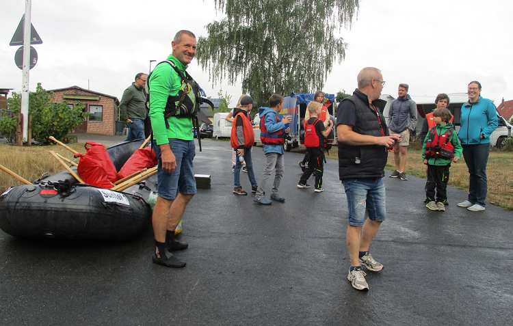 Leichter Regen verzögerte den Aufbau, aber bis zum Eintreffen der weiteren 6 Teilnehmer war der Regen verzogen und nach check in und Einweisung, dem Anlegen der Schwimmwesten und Verstauen der persönlichen Bordausstattung konnte die erste Tour starten. Mit Markus Langer als erfahrenen Kanufahrer und Schlauchbootfahrer als Schlagmann und Herm Henkel als Steuermann starteten wir mit gutem Gefühl und schafften die Strecke bis Bodenwerder trotz Gegenwind in akzeptabler Zeit.