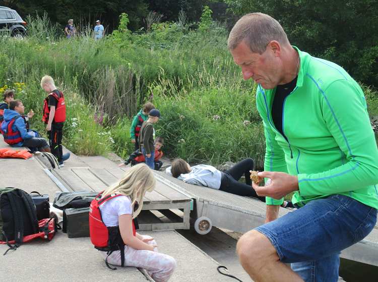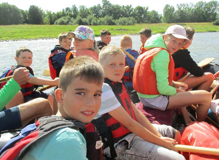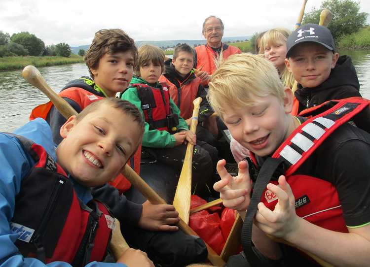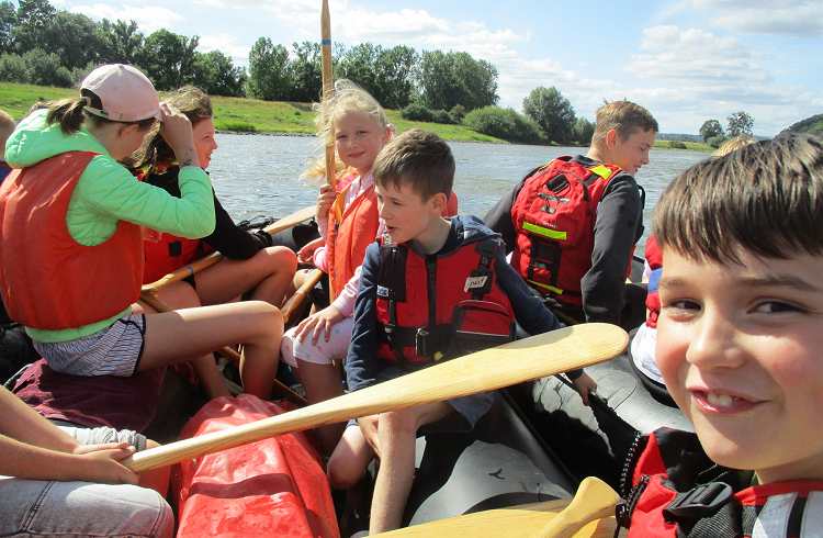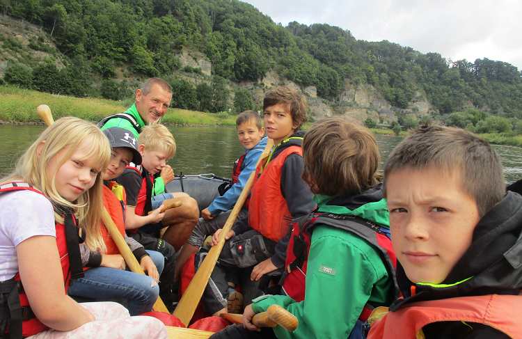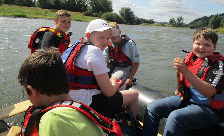 Insgesamt 20 Kinder und 3 Steuerleute verteilten sich auf die 3 Schlauchboote und mit großen Erwartungen ging es auf die Weser. Die Steuerleute Matthias Weiss, Markus Langer und Herm Henkel hatten alle Hände voll zu tun, denn böiger Wind und niedriger Wasserstand (1,02 Meter, Pegel Hameln) verlangten viel Kraft und Einsatz von allen Teilnehmern. Aber zwischendurch wurde, wie auch bei der ersten Tour am Vormittag, auch einfach Pause gemacht, gespielt und gesungen, letzteres allerdings nicht mit so viel Begeisterung. Offensichtlich sind Seemannslieder derzeit nicht so hoch im Kurs. Natürlich wurde auch Wissenswertes über den Fluss, die Binnenschiffahrtsordnung und über das Weserbergland vermittelt.