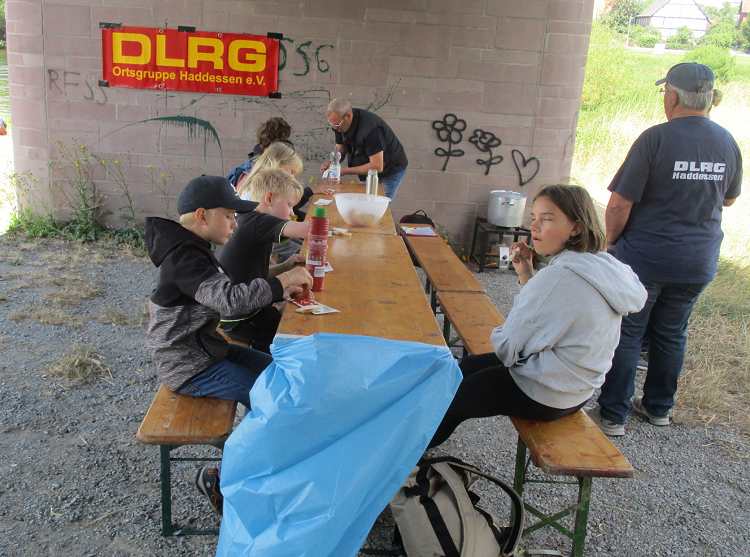 Nach ausgiebiger Pause führte uns die Fahrt weiter bis Hehlen, wo wir nach insgesamt 16 km pünktlich um 13.00 Uhr ankamen. Dort hatte unsere Vormittags Service-Crew Anna und Frank Hartmann bereits Tische und Bänke aufgebaut und es gab leckere Wiener Würstchen und Getränke. Nach kurzem Resümee und Hinweise auf die nächsten DLRG-Veranstaltungen der DLRG-Ortsgruppe Haddessen wurden die Kinder auch schon von den Eltern abgeholt und die Teilnehmer der Nachmittagstour trudelten nacheinander ein.