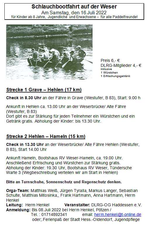 Im Rahmen der Aktion Ferienpass der Stadt Hessisch-Oldendorf fand am Samstag, den 16. Juli 2022 die schon traditionelle Schlauchbootfahrt auf der Weser statt.