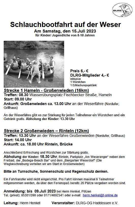 Im Rahmen der Aktion Ferienpass der Stadtjugendpflege der Stadt Hess. Oldendorf fand am Samstag, den 15. Juli 2023 die Schlauchbootfahrt auf der Weser statt.