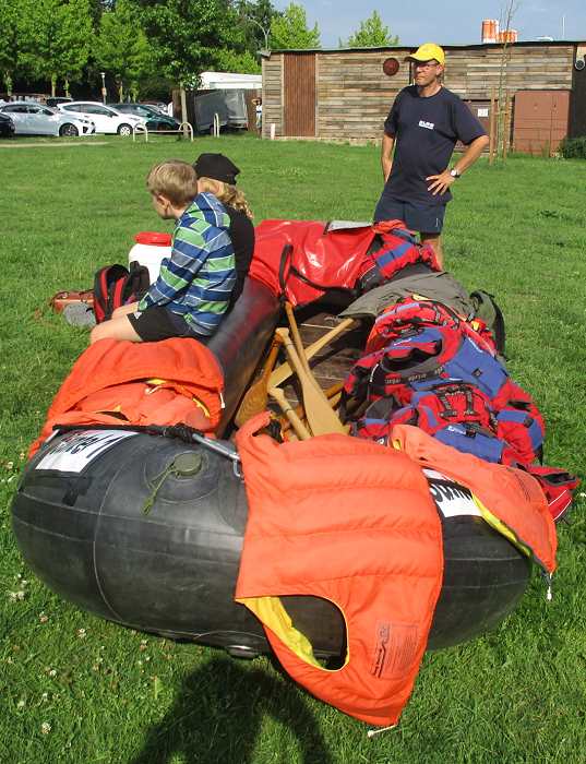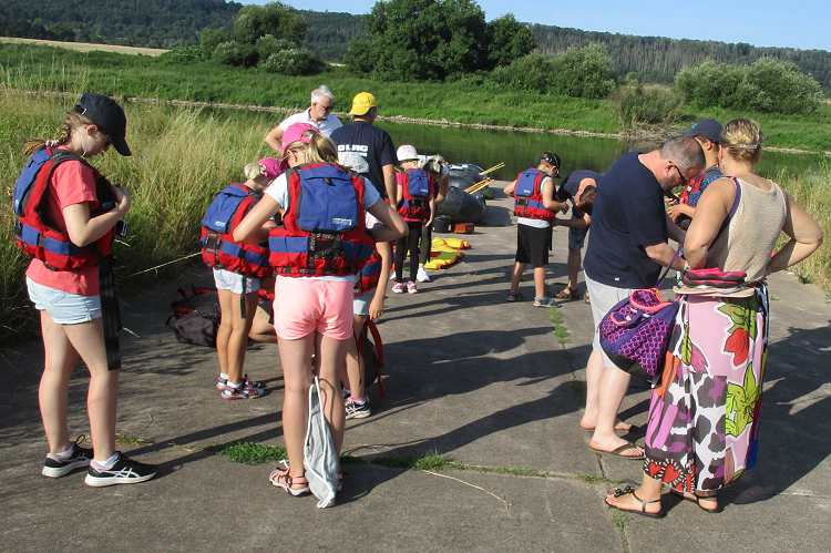 Gut gelaunt und bei noch verhaltenem, aber trockenem Sommerwetter fuhren wir Steuerleute mit der Service-Crew am Samstag, den 15.Juli nach Hameln, wo wir auf dem ehemaligen Übungsgelände der britischen Pioniere „Upnor“ an der Fischbecker Straße die Boote aufbauten und alles für den Empfang der 17 TeilnehmerInnen und die anschließende Nachmittagstour vorbereiten konnten. Nach Check-in, Anpassen der Schwimmwesten und Aufteilung der 2 Bootsmannschaften ging es über zu den ersten Trockenübungen an Land, aber bereits im Boot sitzend. Dann kam der Stapellauf und erste Erfahrung mit niedrigem Wasserstand der Weser (0,96 m Pegel Wehrbergen) konnten gesammelt werden.