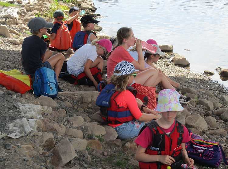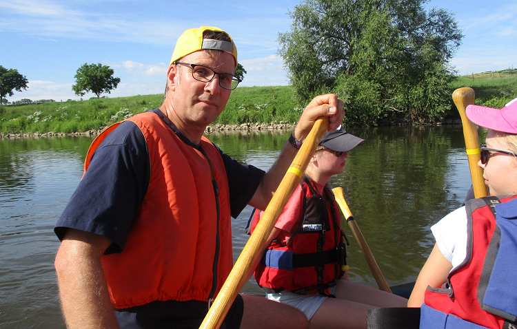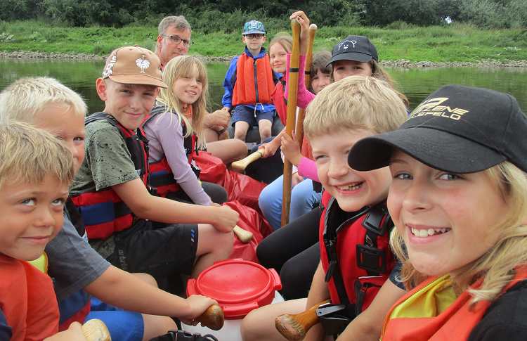 Das Ziel Rinteln war nur 12 km entfernt, sodass wir viel Zeit hatten, uns treiben zu lassen und die Laune an Bord war sehr gut. Wie bei der Vormittagstour kam auch ein Takt ins Paddeln und es wechselten sich paddeln, Ball spielen, Kennenlernspiele, Singen und treiben lassen und ausgedehnte Pausen an Land einander ab. Wir waren bereits um 17.30 Uhr am Freibad/ Weserbrücke Altstadt in Rinteln, 1/2 Std. früher als geplant. So hatten wir ausgiebig Zeit zum Abbauen, Verpflegung fassen und uns bei allen zu bedanken, die diese Tour ermöglicht hatten. Dank geht an die Steuerleute Matthias Weiß und Herm Henkel. Der Dank geht auch an die Service-Crew Peter Herrmann und Horst Böcker am Vormittag und Peter Herrmann und Jörg Wolter am Nachmittag. Dank auch an Marvin Fox, der beim Aufbau am Freitag und Abbau am Sonntag mit angepackt hat. Eine schöne Tour und die positiven Reaktionen der Teilnehmer ermutigen uns, auch im nächsten Jahr wieder eine Schlauchbootfahrt im Rahmen der Aktion Ferienpass anzubieten.