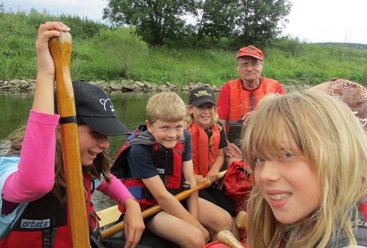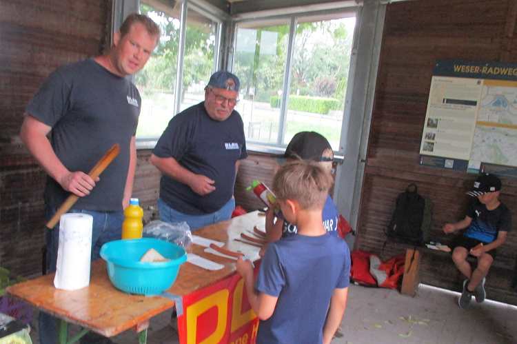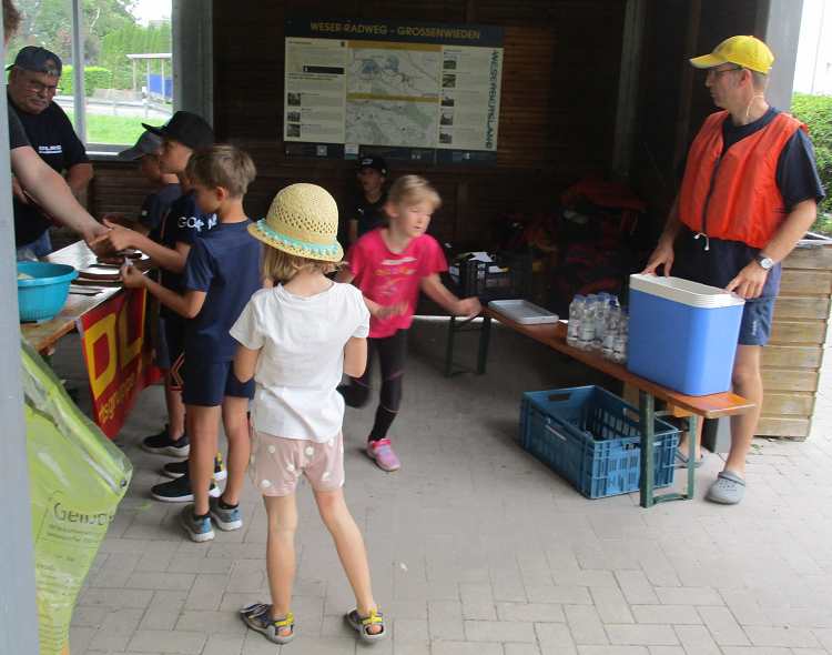 Nur 10 Sportboote überholten uns auf der Strecke von Hameln nach Großenwieden auf den 15 Stromkilometern. Die Gruppe lernte schnell das paddeln und bald waren auch alle Informationen über die Weser, die wichtigsten Kenntnisse über Boot und Schiffsverkehr vermittelt und die TeilnehmerInnen vertrieben sich die Zeit mit paddeln, dösen, Ball spielen, Lieder singen und Lunchpaket essen. In Großenwieden um 12.30 Uhr angekommen, stärkten sich die TeilnehmerInnen und die Nachmittagscrew trudelte nacheinander ein.
