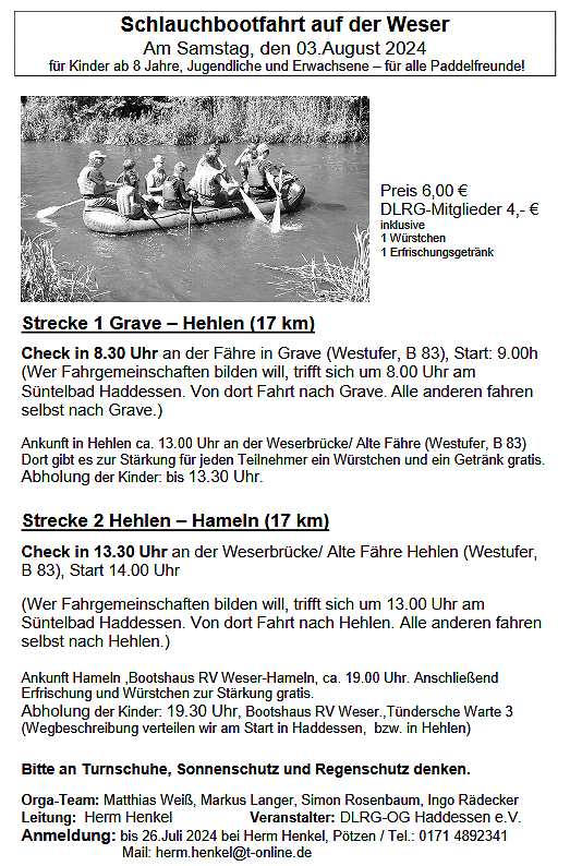 Die Wettervorhersage war durchwachsen, mal Sonne, mal leichter Regen und Gewitter gegen Abend. Also durchaus machbar für eine Weser-Schlauchboottour. Bereits am Freitag, den 02. August 2024 wurden im Süntelbad Haddessen am DLRG-Heim 2 Boote aufgebaut und das gesamte Material einschließlich Schwimmwesten und Tischen und Bänken und Küchenmaterial auf den DLRG-Anhänger und den DLRG-Bus verteilt.