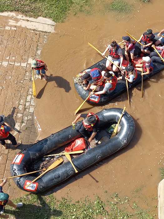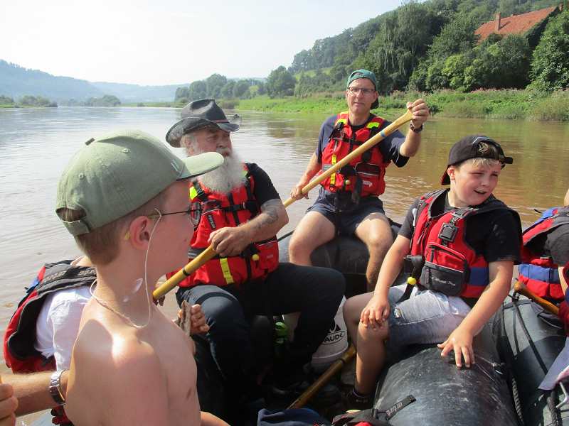 Insgesamt 9 Kinder und 2 Steuerleute fuhren mit 1 Schlauchboot weiter und mit großen Erwartungen ging es auf die Weser. Aber zwischendurch wurde, wie auch bei der ersten Tour am Vormittag, auch einfach Pause gemacht, gespielt und gesungen. Offensichtlich sind Seemannslieder derzeit wieder hoch im Kurs. Natürlich wurde auch Wissenswertes über den Fluss, die Binnenschifffahrtsordnung und über das Weserbergland vermittelt. Nach verdienter Pause in Emmerthal brauchten die Besatzungen noch 1,5 Stunden bis zum Ziel, dem Bootshaus des RVW in Hameln. Hier konnten sich alle erholen und wurden von der Service-Crew mit Würstchen und Getränk verwöhnt.