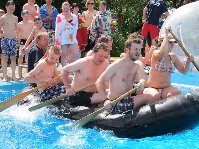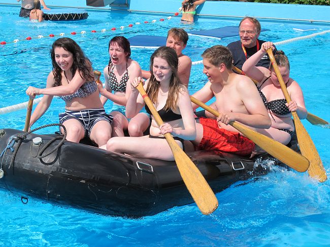 Zu meistern waren die Aufgaben Schlauchbootfahren, Wasserballspiel und Großballspiel auf dem Rasen. Der 4. Platz ging an die Gruppe 'Team ZELA' vom CVJM-Quelle, der 3.Platz an die Gruppe 'Die Geissens' aus Haddessen, der 2.Platz an die Gruppe 'FBGM' aus Haddessen und der 1.Platz an die Gruppe 'Alt und Ranzig' vom CVJM Quelle aus Bielefeld. Der Wettkampf war spannend, aber auch fair und machte allen offensichtlich viel Spaß.