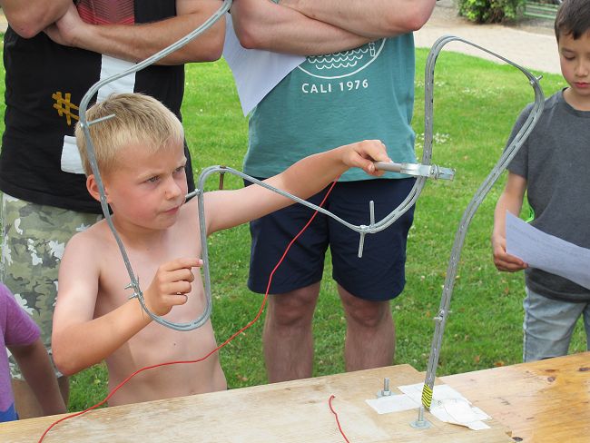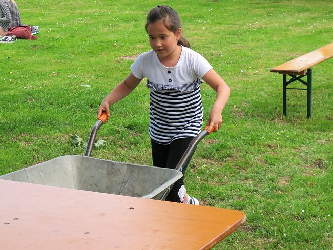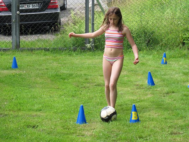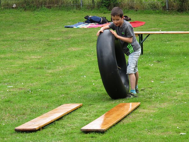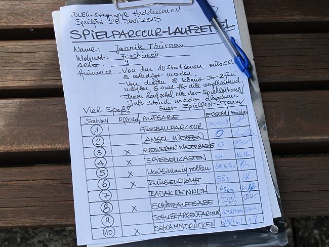 Genau 45 Teilnehmer starteten auf den Spielparcour, darunter auch Familien und Teilnehmer aus Hameln, Heinade, Emmerthal und natürlich aus dem gesamten Stadtgebiet der Stadt Hess.-Oldendorf, darunter 8 Kinder, die sich über den Ferienpass der Stadt Hess.-Oldendorf angemeldet hatten. Entsprechend dem sportlichen Ereignis des Jahres, durften die Teilnehmer als Erstes einen Fußballparcour absolvieren. Eine weitere Ballaktivität war das Zielwerden auf einen Wasserbasketballkorb. Auch Schwammdrücken und Angelschnurwerfen standen auf dem Laufzettel, ebenso Lkw-Schlauch rollen, Spiegelkasten und Klingeldraht beherrschen, Schubkarre über einen Parcour lenken, Kajakrennen fahren und Anzahl von Gummibärchen im Glas schätzen.