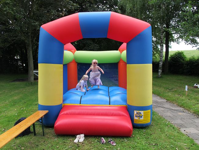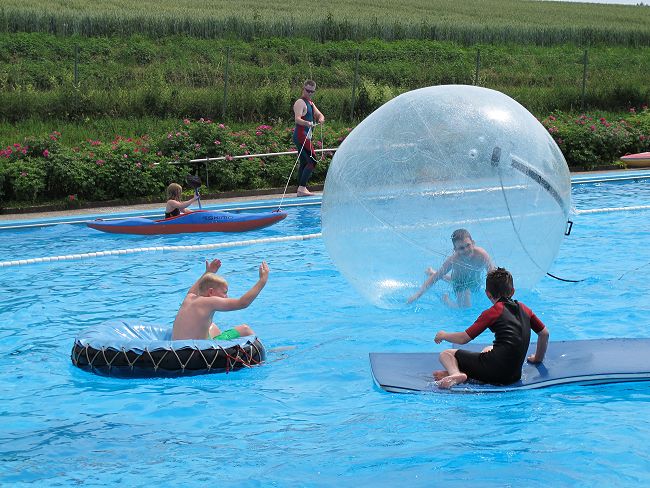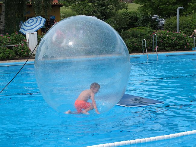 Nach solcher Stärkung konnten interessierte den großen Wasserball besteigen und über das Wasser in dem Ball laufen. Oder sich auf der Hüpfburg austoben oder sich auf Pedalo oder Stelzen austoben.