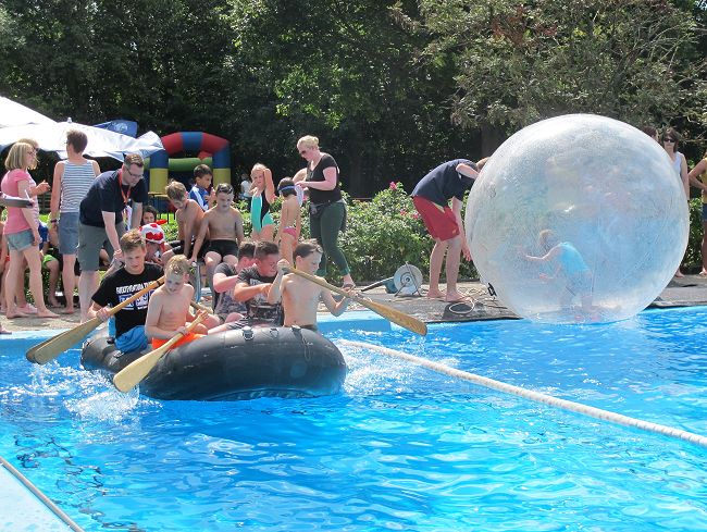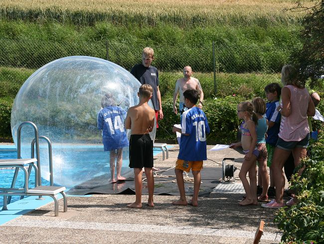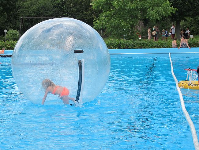 Nach solcher Stärkung konnten Interessierte den großen Wasserball besteigen und über das Wasser in dem Ball laufen, oder sich auf der Hüpfburg austoben.