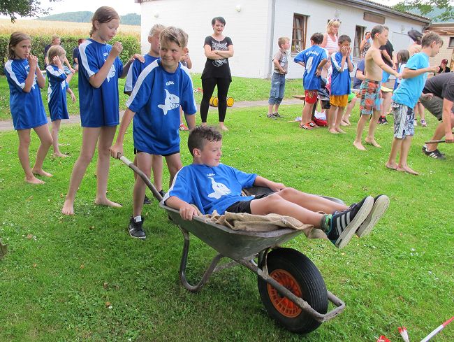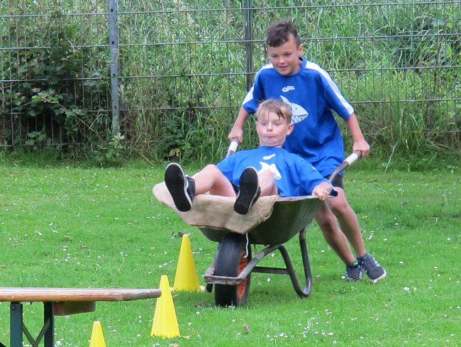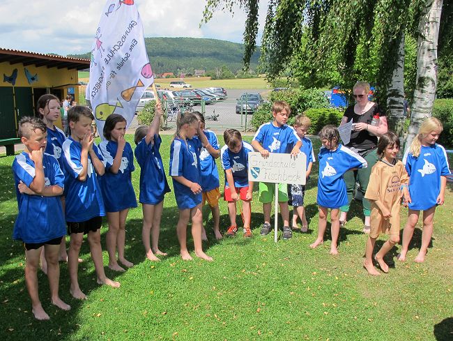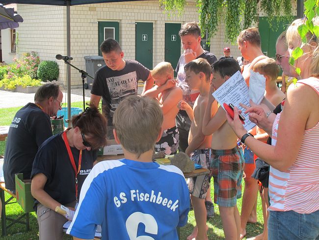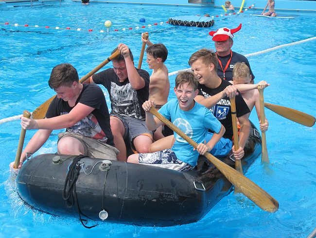 Zu meistern waren die Aufgaben Schlauchbootfahren, Wasserballspiel und Schubkarrenparcour. Der 3. Platz ging an die Gruppe 'Die glorreichen 7' von der GS Fischbeck, der 2. Platz an die Gruppe 'WC-Enten Frisch' aus Haddessen und der 1. Platz an de Gruppe '4a' der GS Fischbeck. Der Wettkampf war spannend, aber auch fair und machte allen offensichtlich viel Spaß.