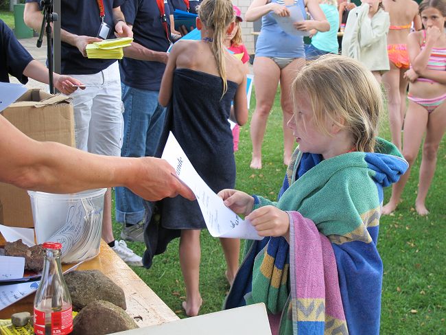 39 Laufzettel wurden abgegeben und alle TN bekamen kleine Erinnerungen und Urkunden als Dankeschön fürs Mitmachen. Die Schätzaufgabe löste exakt Emma Lohrbert aus Fischbeck. Der Lohn: der geschätzte Eimer mit den 34 Pfirsichen.