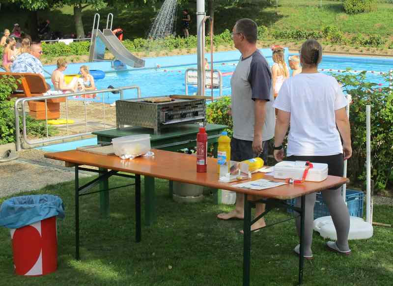 Wie immer stand bei so einer Open-Air-Veranstaltung alles unter dem Vorbehalt des Wetters. Aber die Bedingungen waren ideal am Samstag, den 09. August: Die Lufttemperatur pendelte sich bei 28 °C ein, das Wasser war mit 23 °C auch sehr angenehm. Am Nachmittag von 15.00–18.00 Uhr standen Angebote für Kinder und Familien im Mittelpunkt. An 10 Stationen mussten folgende Aufgaben auf dem Spielparcours erledigt werden: brennendes Haus löschen, Dosen werfen, Flaschen kegeln, Schubkarrenparcours, pendelnde Eimer treffen, heißen Draht, Cornhole, Wasserbomben-Zielscheibe, Schatzsuche und Schätzaufgabe. Im Schatten unter den hohen Bäumen konnten Kinder an einem Malwettbewerb teilnehmen und basteln. Auf dem Schwimmbecken lockte eine 10 m lange und 5 m breite Wasserschaukel, Badematten und Reifen. Auf der Liegewiese konnten sich Kinder noch auf der Hüpfburg austoben. Das Angebot am DLRG-Grillstand und vom Kiosk sorgte für das entsprechende leibliche Wohl. 60 Kinder holten sich den Laufzettel ab und wurden oft von Geschwistern, Eltern, Freundinnen und Freunden begleitet. An die 100 Personen vergnügten sich auf dem Gelände des Freibades.